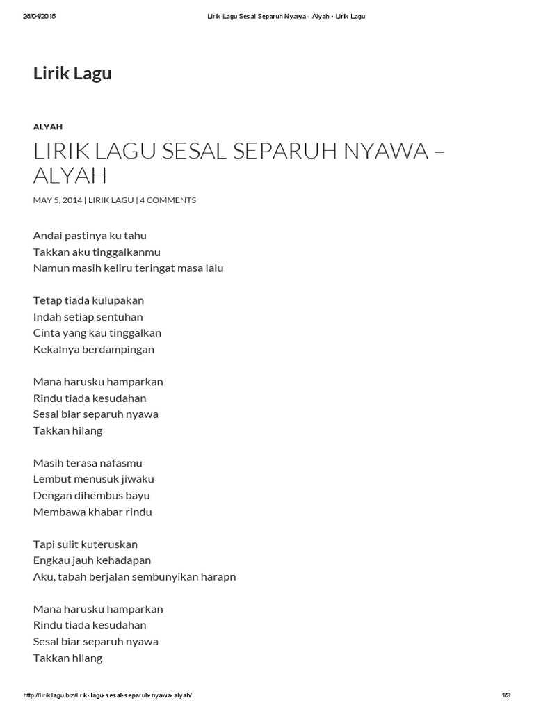 Lirik Lagu Sesal Separuh Nyawa Alyah Lirik Lagu Pdf